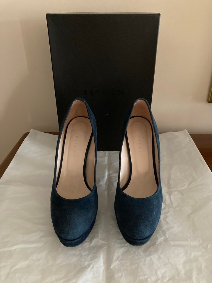 Lacivert süet stilettolar platform topuklu ve minimalist, çağdaş tasarıma sahip. Ofis için klasik zarafetle kolay şıklık sunar. Bir iki kere kullandım deformesi yoktur