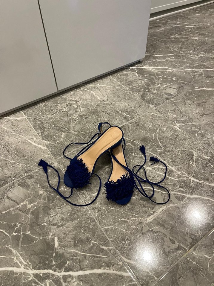 Lacivert süetten yapılmış, nakışlı ve püsküllü ince topuklu ayakkabılar. Romantik akşamlar için bağcıklı bohem tarzda.