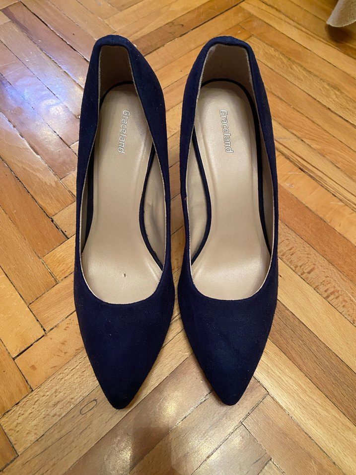 Lacivert süet malzemeden yapılmış, klasik ve desensiz stiletto. Sivri burun ve ince topuklu, 9 cm.