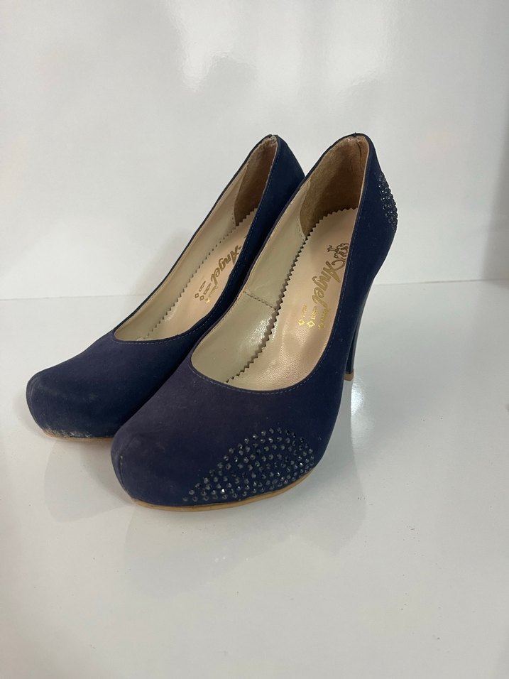 Lacivert süet malzemeden yapılmış, taş işlemeli stiletto topuklu ayakkabılar. Romantik akşamlar için şık ve modern klasik tarzda.