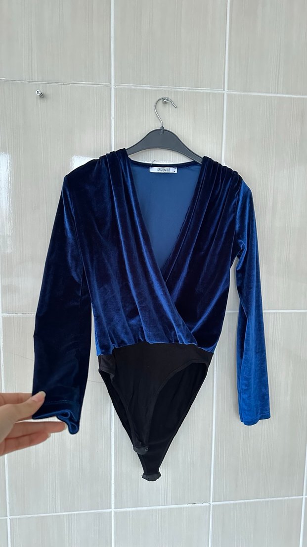 Lacivert süet kumaştan, v yaka ve uzun kollu, drapeli tasarıma sahip, midi uzunlukta, parti için uygun kadın bluz. ✨