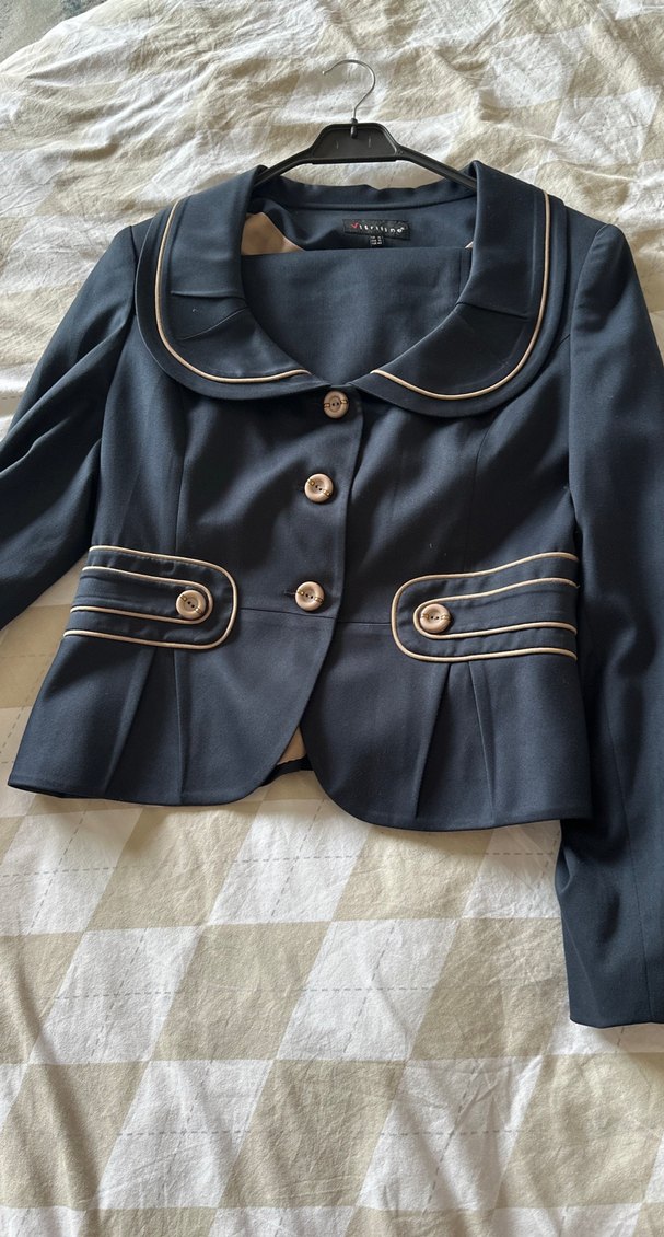 Düğmeli, kadın blazer ceket, modern klasik stil ve kesimle. Uzun kollu, normal midi boyda, ofis için uygun parlak pamuklu kumaştan yapılmıştır. Eteğimi ile takım 38 40 beden bir ofis çalışanı için kurtarıcı. Vitriline marka ama burada bulamadım vakko yazdım aynı kalite ✨