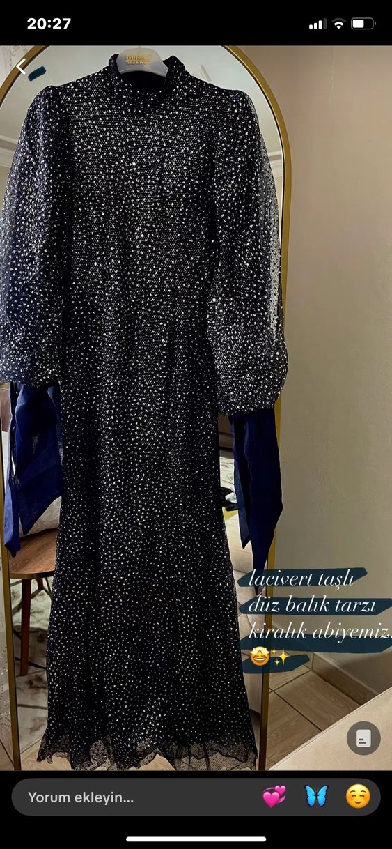 Lacivert renkte, taşlı tesettür kadın abiye. Mütevazı ve gösterişli tarzda, sokak modasına uygun. 1 kez giyildi satılıktır