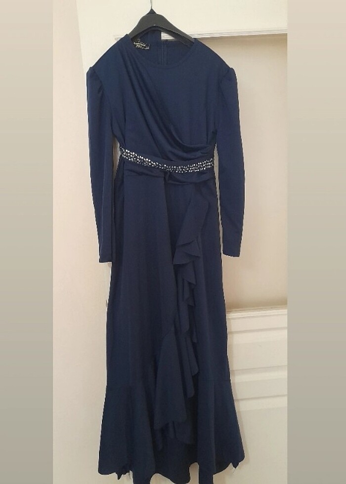 Lacivert taşlı kemerli tesettur abiye