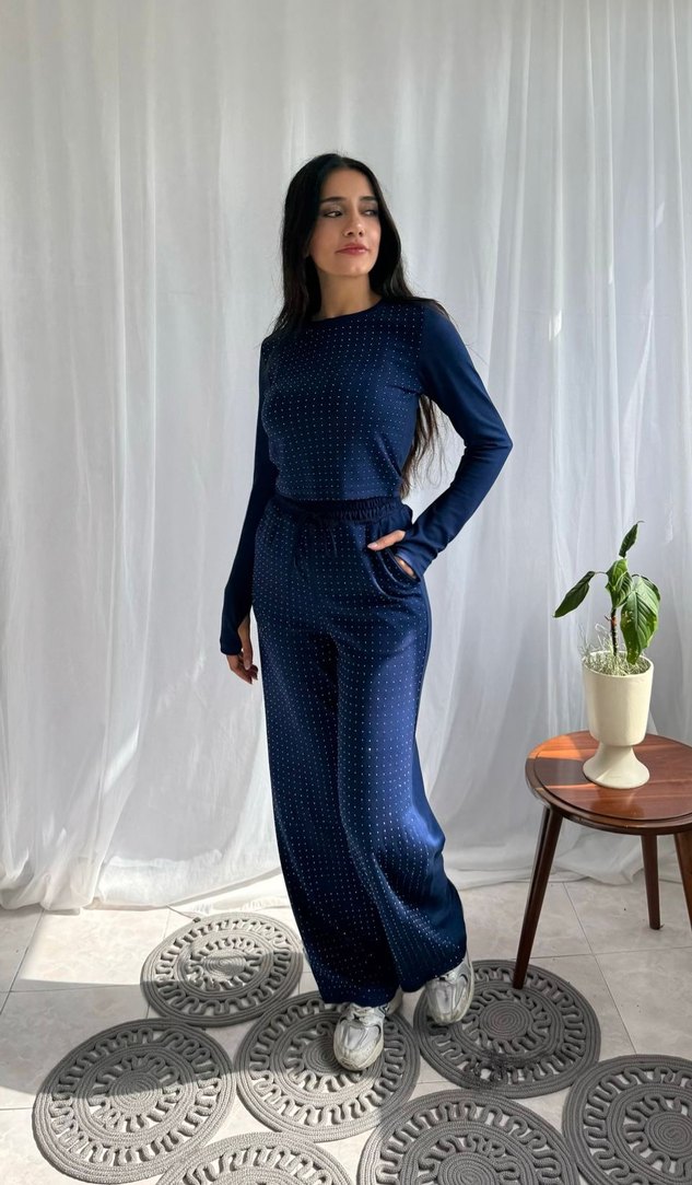 Lacivert taşlj oyşho kumaştan üretilmiş, uzun kollu, bisiklet yaka, rahat kesim kadın eşofman takımı. Günlük kullanıma uygun, şık ve rahat bir tasarım.