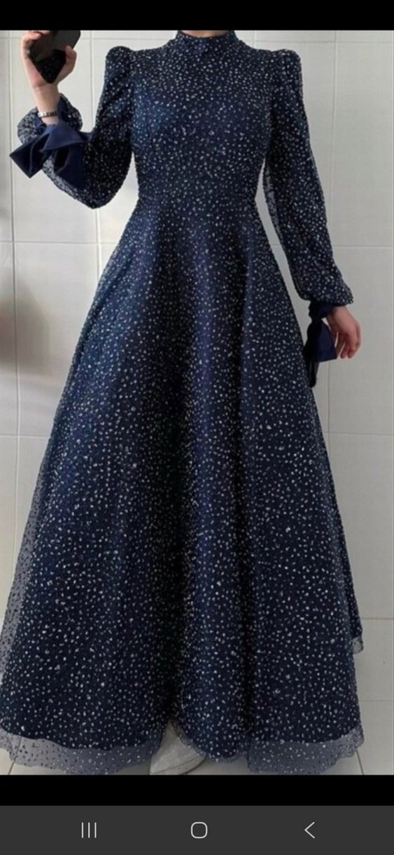 Lacivert renkte, taş desenli, V yaka ve uzun kollu, drapeli, klasik şık bir uzun abiye elbisedir. Düğünler için uygundur. ✨