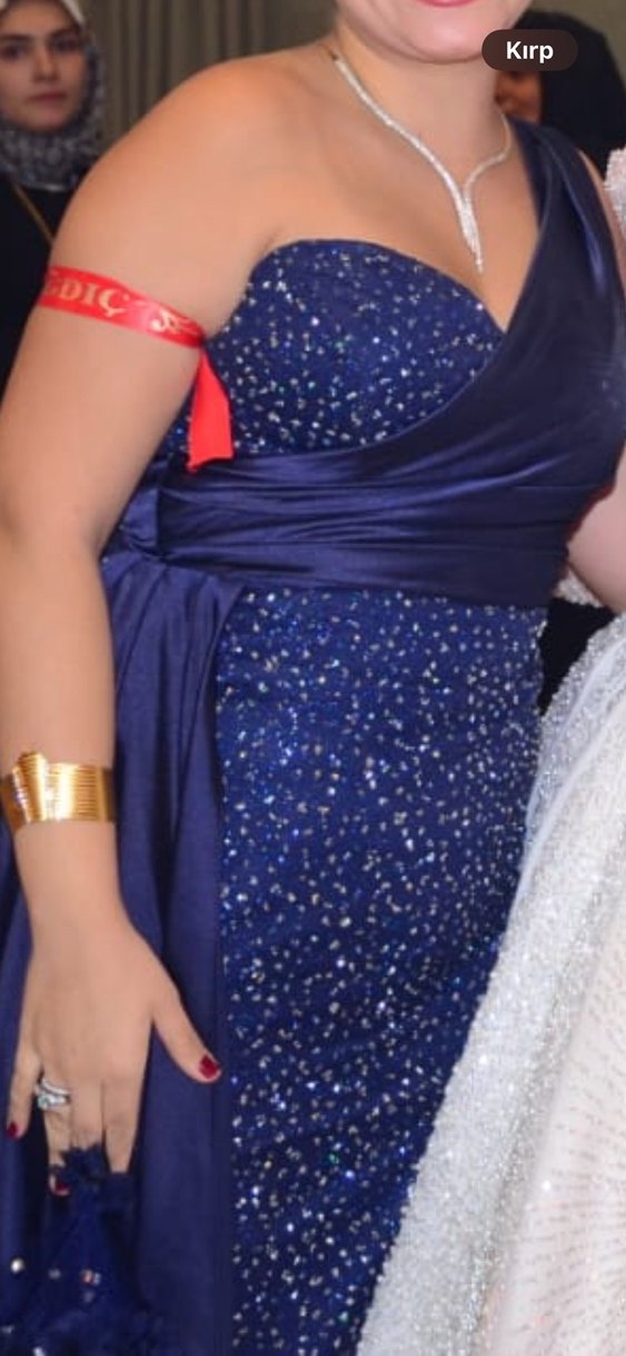 Lacivert taşlı yandan kuyruğu olan tek omuz, uzun ve dar kesim nişan elbisesi, alt kısmında görünmeyen yerde topuğum takıldı biraz sökülme var