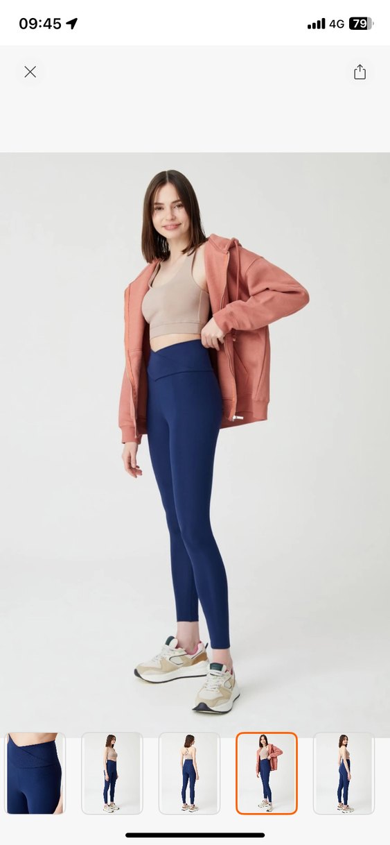 Hafif bej renkli, yumuşak sentetik kumaştan spor büstiyer ve lacivert, diz boyu, desen içermeyen, dar kesim tayt kombini. Spor ve günlük kullanıma uygun. S m bedene olur.