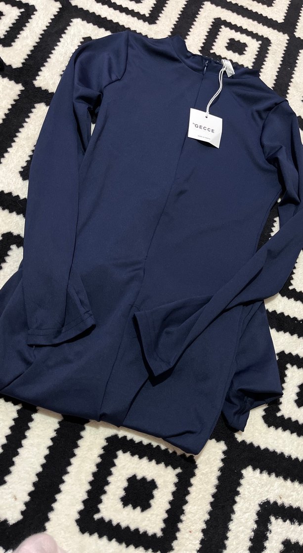 Lacivert, yüksek yakalı, uzun kollu tulumu, rahat sentetik kumaştan, gündelik kullanım için şık ve sade bir modeldir.