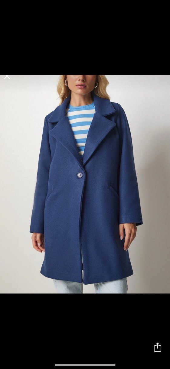 Lacivert renkte, tek düğmeli, yaka detaylı ve yan cepli, yumuşak ve sıcak kumaştan kaban. Etiketli ürün 38 beden