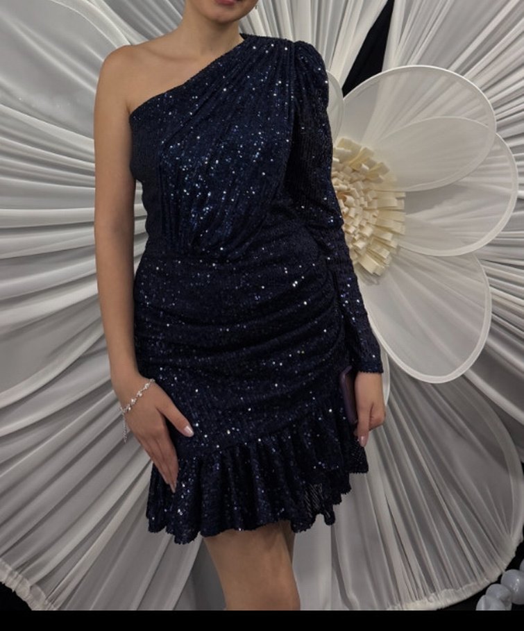 Lacivert mini abiye elbise, tek omuz parti stilleri için uygundur. ✨