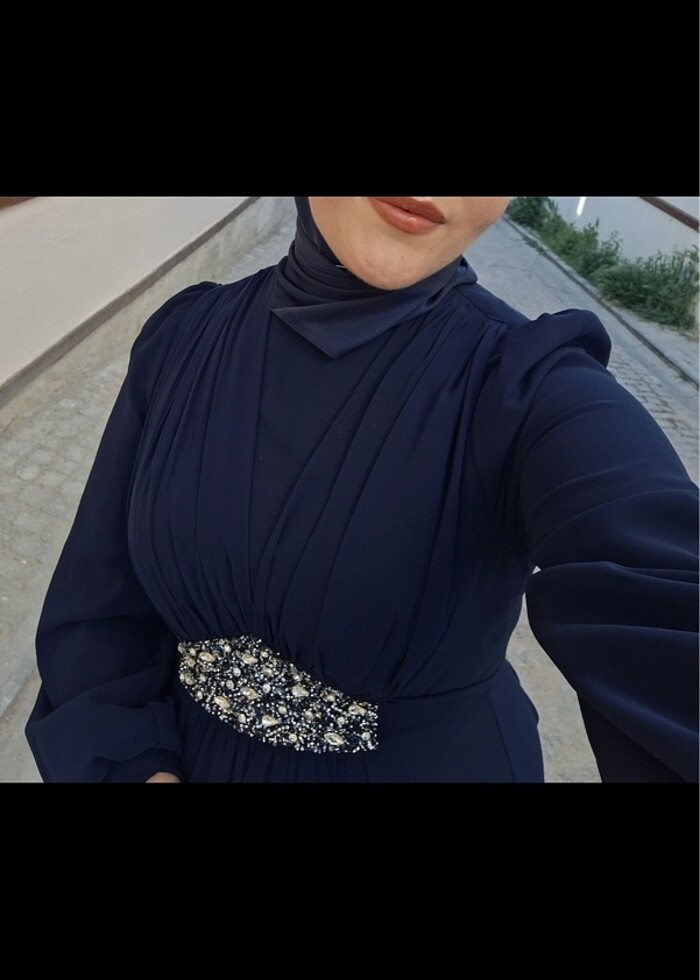 Lacivert drapeli taşlı kemerli abiye bir kez kullanıldı. 42 beden giyiyorum tam oldu kemerden dolayı belimi tam sardı kumaş olarak dökümlü durduğu için olduğumdan daha zarif gösterdi. Eşarp dahil.