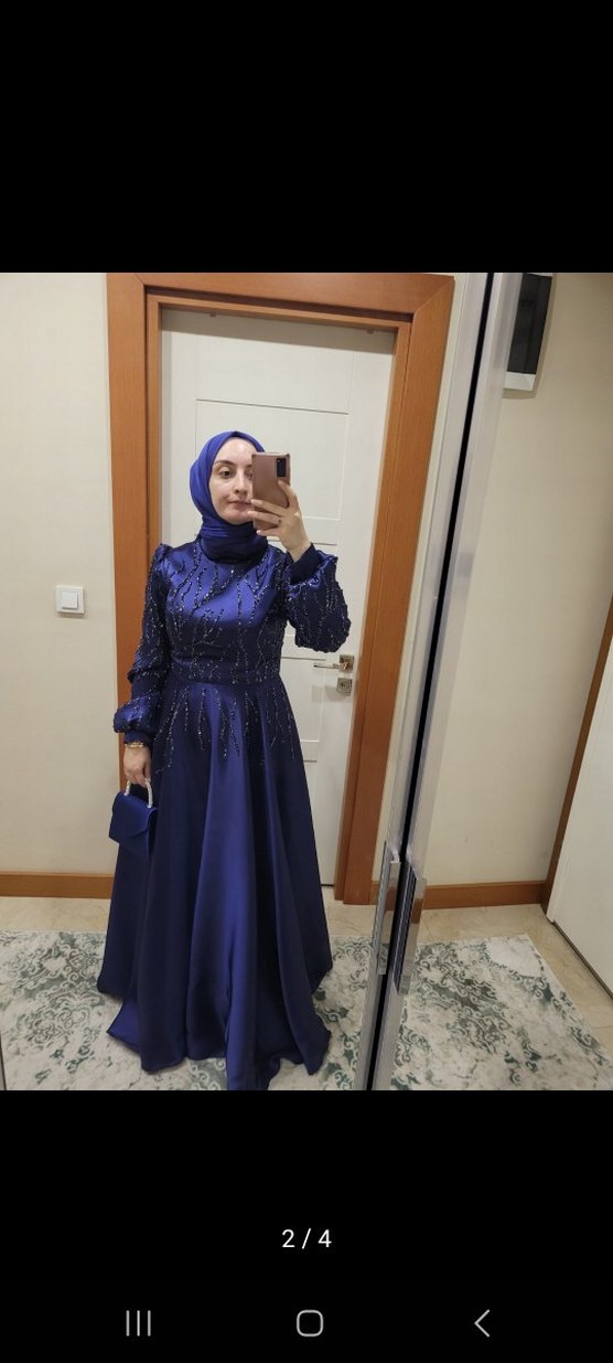 Lacivert renk, işlemeli uzun kollu, yüksek yakalı, bol kesim ve drapeli uzun abiye elbise. Düğünler için uygundur. 1 kere giyildi . herhangi bir sorunu bulunmamaktadır. şalı da hediye olarak göndereceğim.