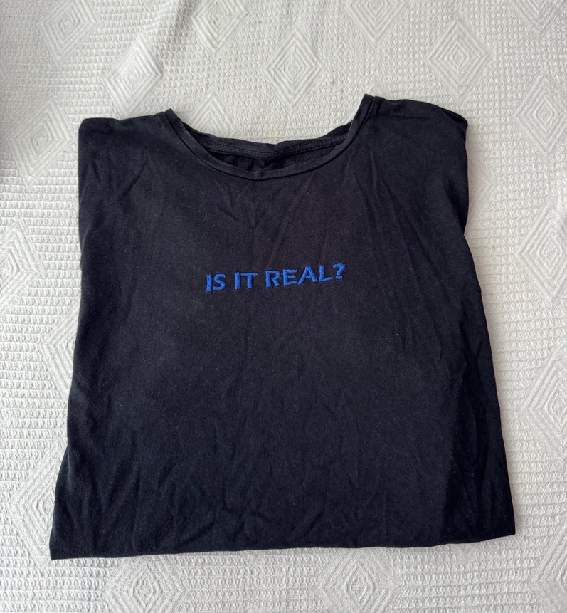 Lacivert tişörtü, kısa kollu ve yuvarlak yakalıdır. Sentetik kumaştan üretilmiş, baskılı "IS IT REAL?" yazısı bulunur. Günlük kullanıma uygundur.