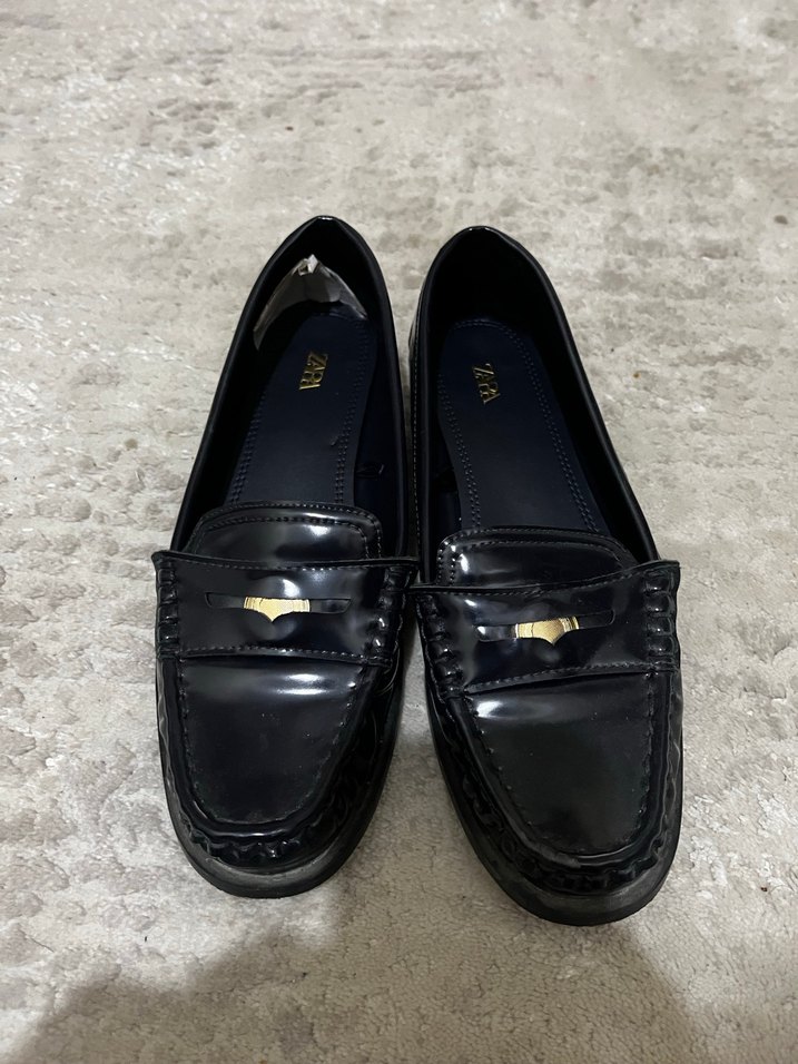 Lacivert deri, tokalı ve blok topuklu klasik kadın loafer, ofis ve sokak stili için uygun rahat tasarım.