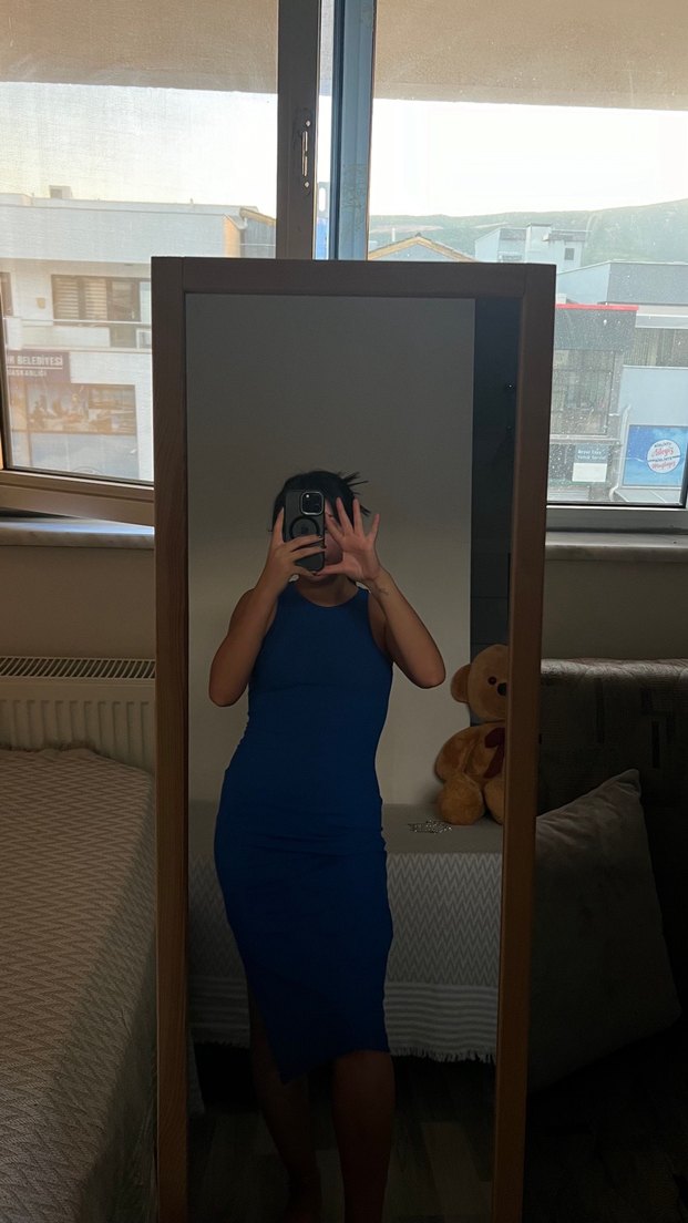 Lacivert renkte, yüksek yakalı ve kolsuz, transparan detaylara sahip, denim kumaştan yapılmış, vücuda oturan midi elbisedir. Romantik akşamlar için uygundur.