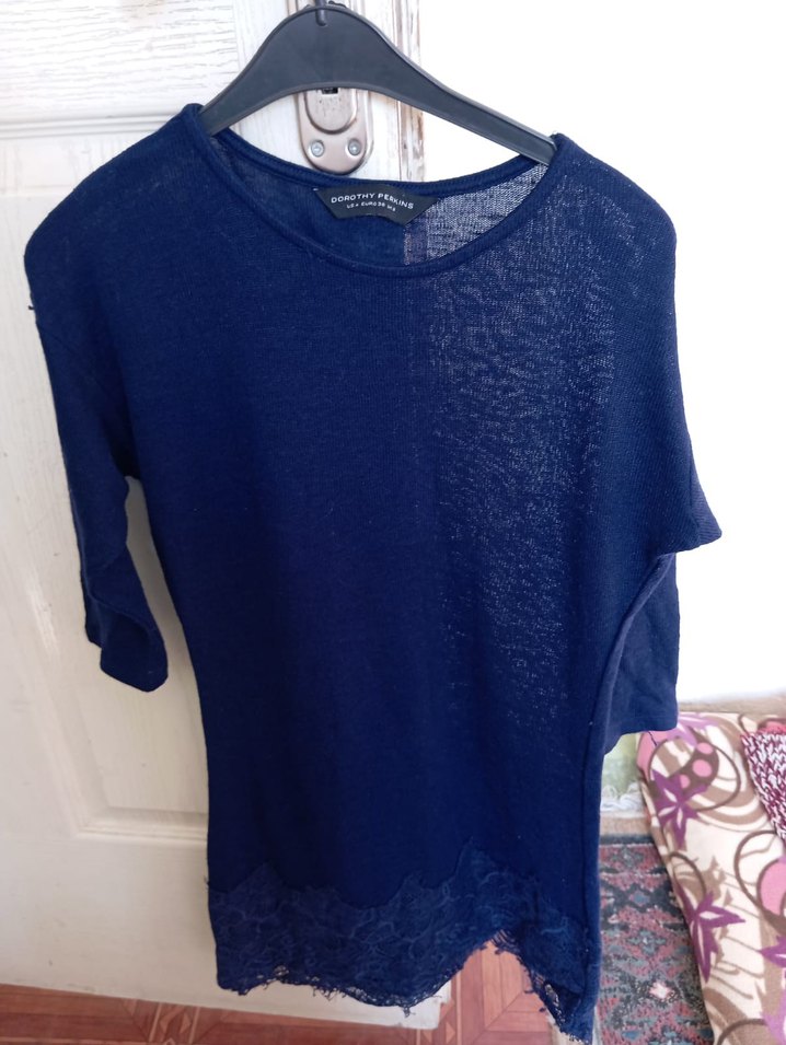 Lacivert renkli triko, kısa kollu, yuvarlak yaka ve bol kesim kadın bluz. Normal midi boyda, desensiz ve günlük sokak stiline uygun.