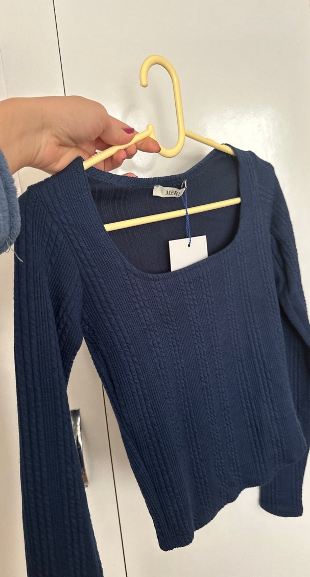 Dar kesim, uzun kollu, yuvarlak yakalı ve triko dokulu lacivert kadın bluz. Normal midi boyda, günlük kullanıma uygun. Bana dar geldiği için ve bir büyük bedeni de tükendiği için satıyorum