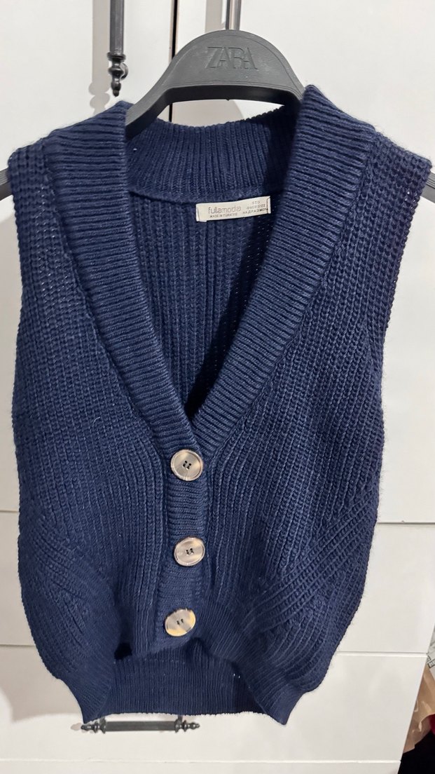 Lacivert renkte, düğmeli, triko dokuma, kolsuz ve normal boyda kadın süveter. Rahat ve desensiz tasarıma sahip, günlük kullanıma uygun.