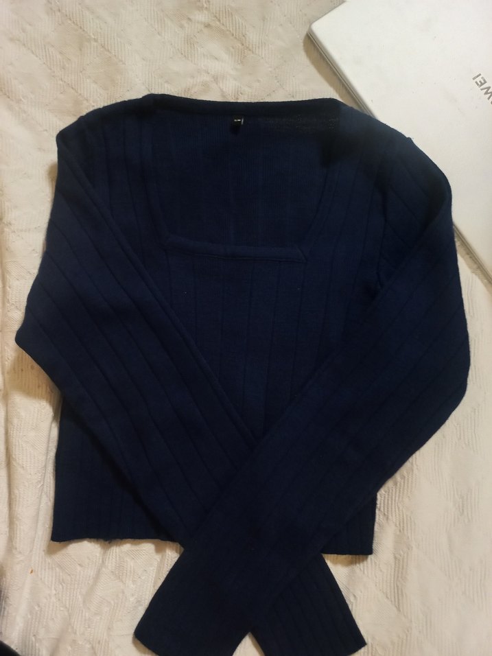 Lacivert renkte, uzun kollu ve yuvarlak yakalı kadın triko kazak. İnce kesimi ve örme dokusu ile rahat ve şık bir görünüm sunar.
