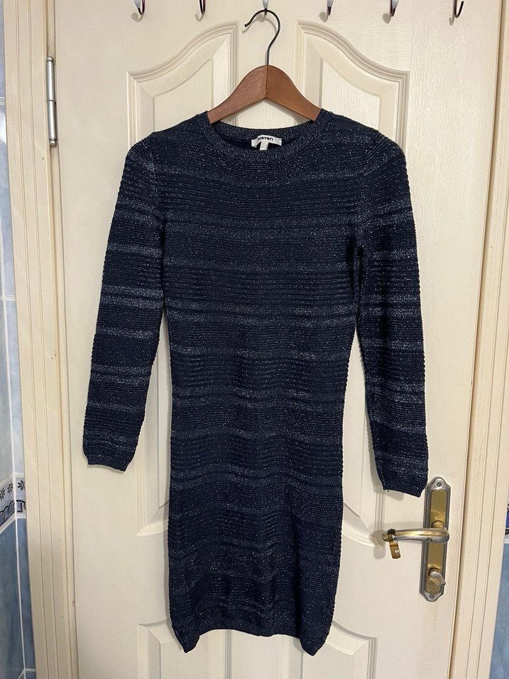 Fitted kesim, uzun kollu lacivert triko elbise, yuvarlak yaka ve midi boy ile ofis için uygundur. Rahat ve modern bir görünüm sunar. İki koltuk altı arası eni 42 cm boy 100 cm