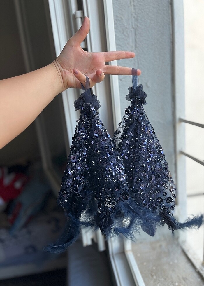 Lacivert Tüylü Boncuklu Gelin Mendili