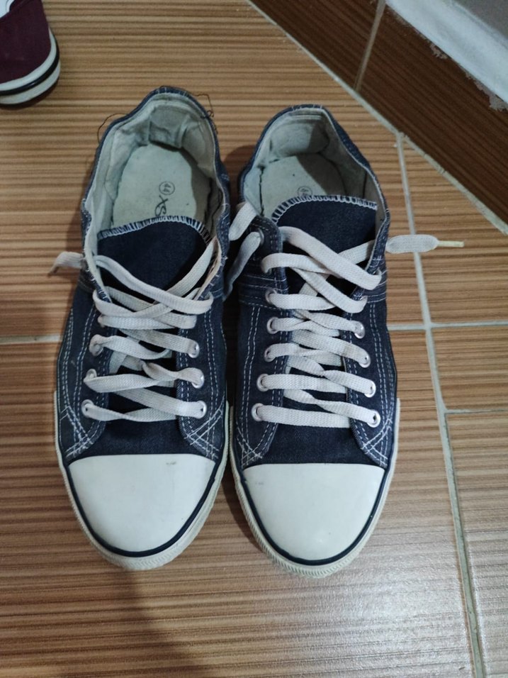 Mavi denim kumaştan, beyaz bağcıklar ve kauçuk burunlu, günlük kullanıma uygun rahat sokak stili sneakers
