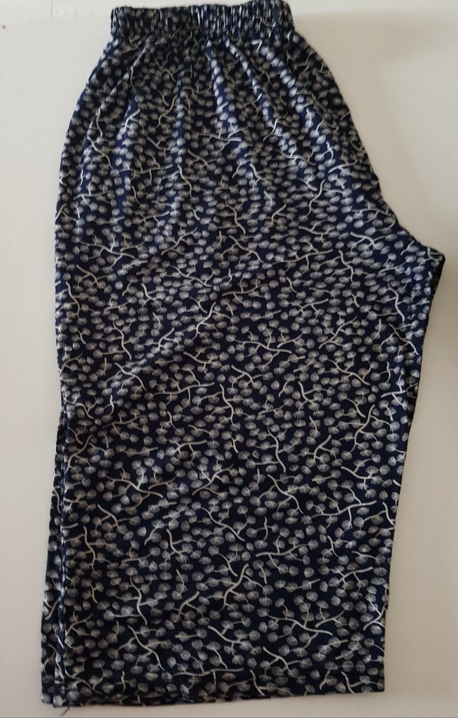 markasız, lacivert üzerine ekru renkte sarmaşık desenli kadın bermuda. esnek ve terletmeyen kumaş. yanlarda iki cep. beli tüm lastik. 52 beden. lastik esnemiş olarak bel tam çevre 120 cm, basen tam çevre 134 cm, bacak dış boy 64 cm, bacak iç boy 36 cm, paça 46 cm. ilkbahar ve yaz giyimine uygun. çok az kullanıldı, temiz ve iyi durumda.