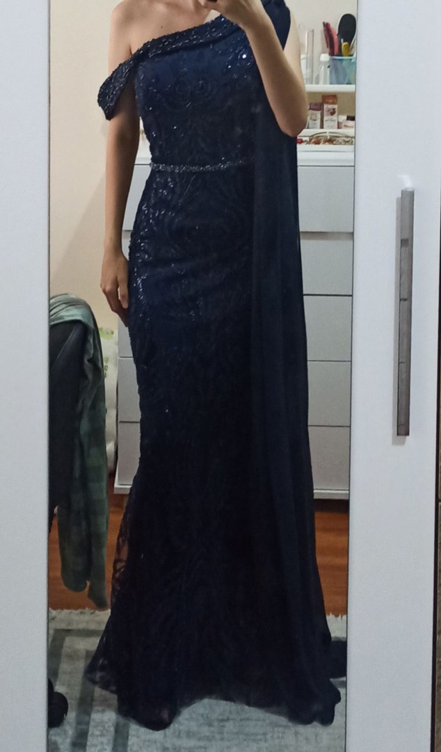 lacivert boncuk işlemeli abiye