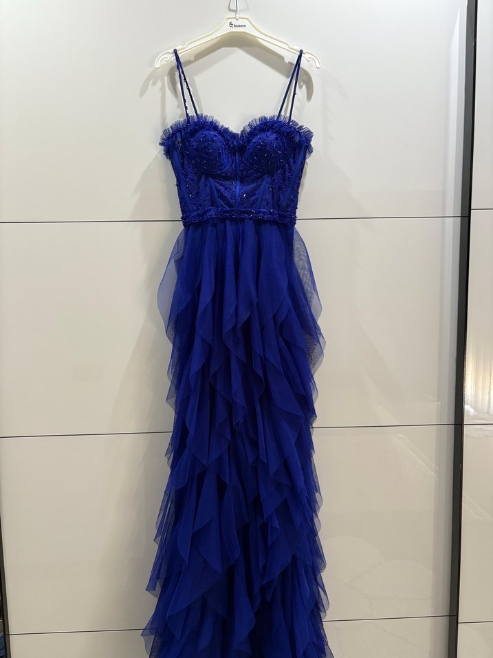 Lacivert renkli, nakışlı ve fırfırlı uzun abiye elbise. İnce askılı, straplez yakaya sahip, düğün ve özel günler için ideal.