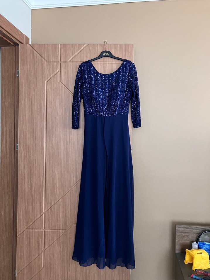 Parlak, lacivert uzun abiye elbise. Uzun kollu ve bol kesim, modern klasik şıklığı yansıtıyor. Üstü tül altı tulum 38-40 beden uyumlu. 42 beden alındı daraltıldı. Yengem kızının nişanında giydi topuklular ile boyu tam oluyor 167 boyda birine