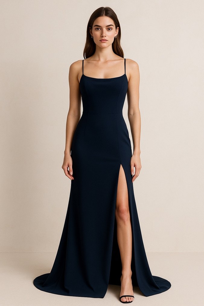 Lacivert uzun elbise, ince askılar ve tekne yaka ile tasarlanmıştır. İpek gibi kumaştan, drapeli ve yırtmaçlı şık bir modeldir. Romantik akşamlar için idealdir. kardeşim sadece 1 kez mezuniyetinde giydi tekliflere açığım.