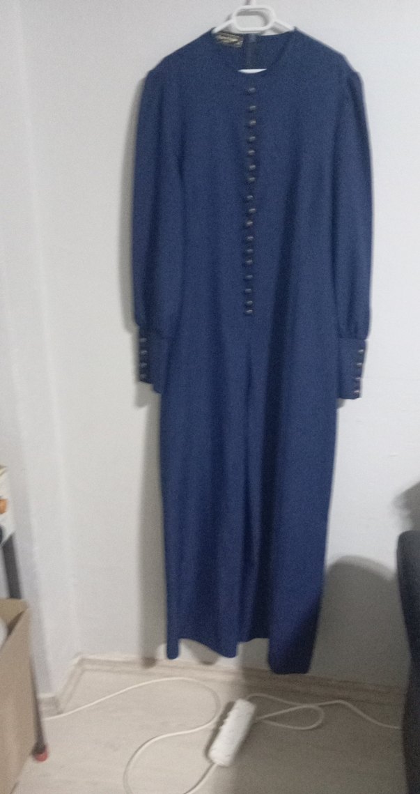 Lacivert uzun denim kumaştan, düğmeli ve notlu yakalı, bol kesim kadın elbisesi. Uzun kollu ve minimalist tarzda, ofis kullanımı için uygun.
