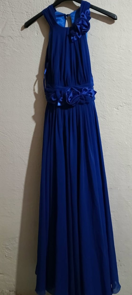 Lacivert, askılı ve straplez yaka detaylı, drapeli ve belinde çiçek süslemeleri bulunan uzun, fitted abiye elbisedir. Düğünler için uygun, modern klasik ve minimal tarzda.