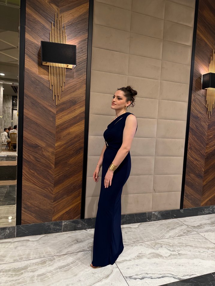 Lacivert uzun abiye elbise, drapeli detaylara, V yaka ve ince askılara sahiptir. Klasik şıklık için regular fit sunar, düğünler için uygundur. ✨ 1 kere giyildi