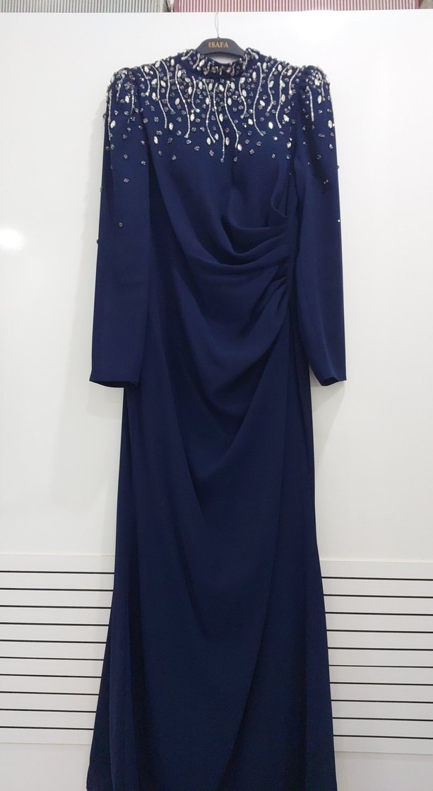 Lacivert uzun kollu, tekne yaka abiye elbise. Drapeli tasarımı ve desenli detaylarıyla klasik ve minimalist şıklık sunar.