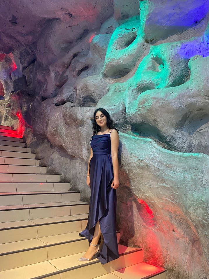 Lacivert uzun boy drapeli, bol kesim ve askılı yaka detaylı kadın elbisesi. İnce askılı, hafif batik desenlidir, gösterişli düğünler için uygundur. ✨