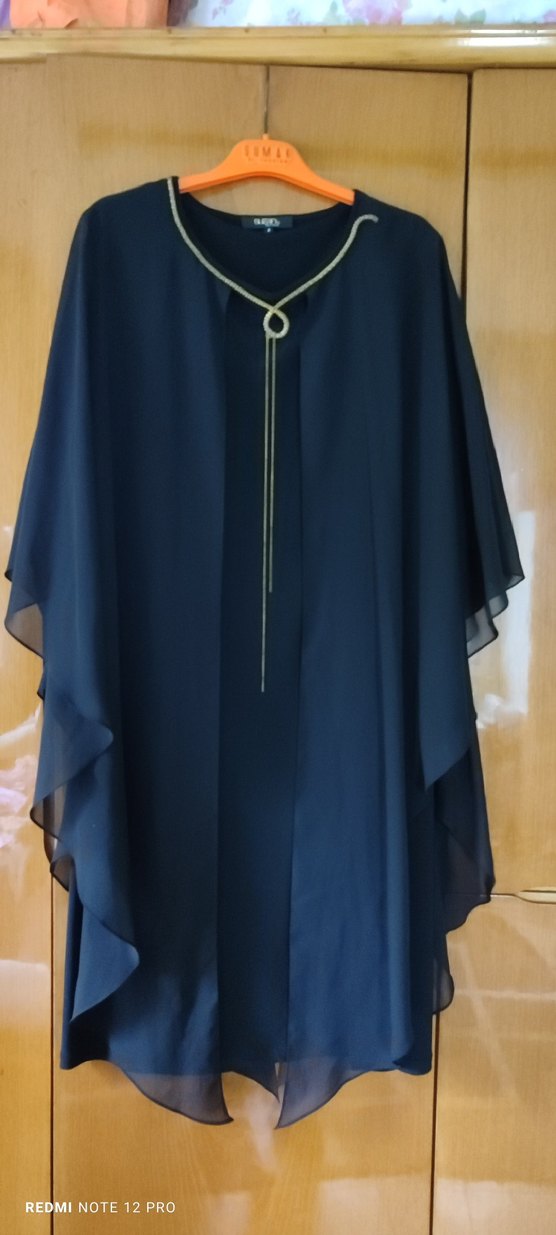 Lacivert uzun abiye elbise, drapeli ve bol kesimdir. Yüksek yakalı ve kolsuz olup gotik tarzı yansıtır. Düğün için uygundur.