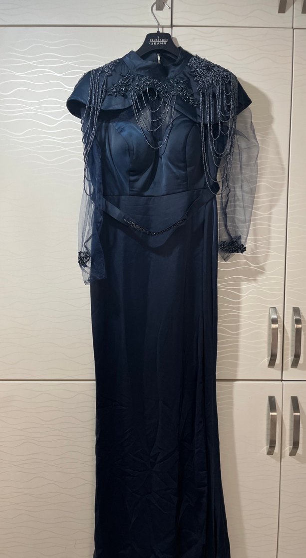 Lacivert, uzun ve vücuda oturan bu abiye elbise yüksek yakalı, drapeli ve işlemeli detaylara sahiptir. Gotik tarzda, gelinlik ge kına elbisesi için uygundur.