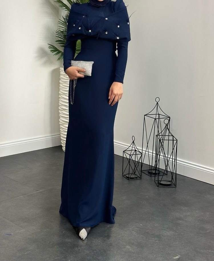 Lacivert uzun abiye elbise, drapeli tasarımı, yüksek yaka ve uzun kollu. Minimalist, çağdaş ve modest bir kesime sahip, düğünler için uygun. 160-50-55 kilo