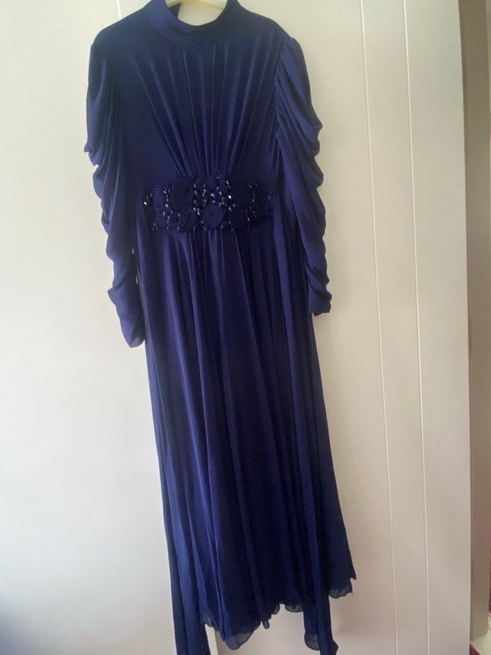 Lacivert uzun abiye elbise, yüksek yakalı ve uzun kollu, şık drapeli tasarıma sahiptir. Bol kesim ve boncuklu bel detayıyla düğünler için uygundur. Yalnızca bir kere giyildi