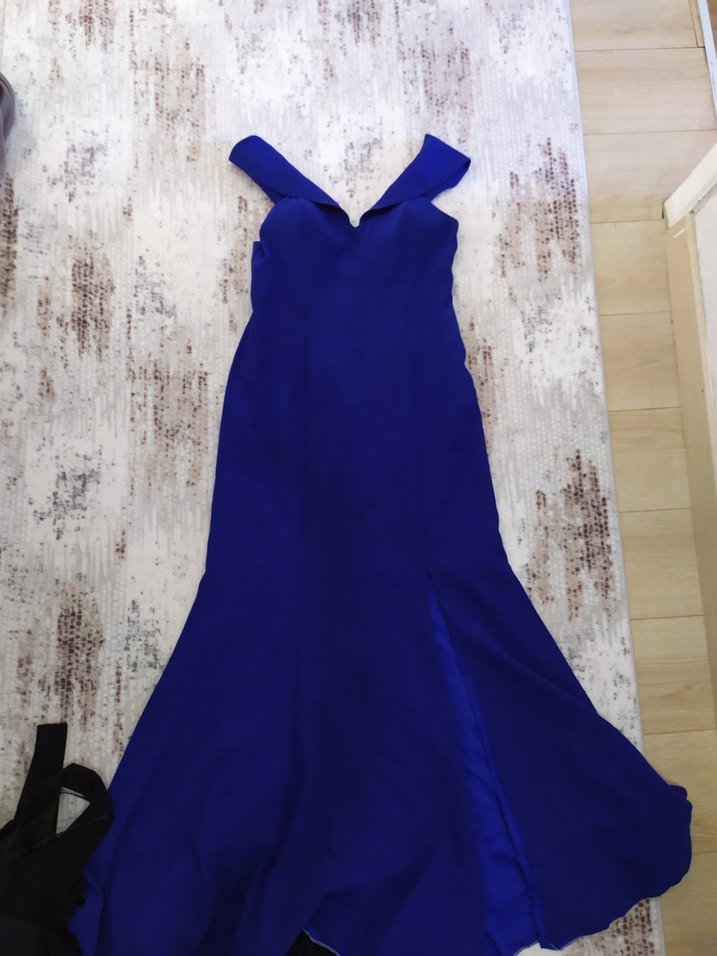 Lacivert Uzun Drapeli Kadın Abiye Elbise
