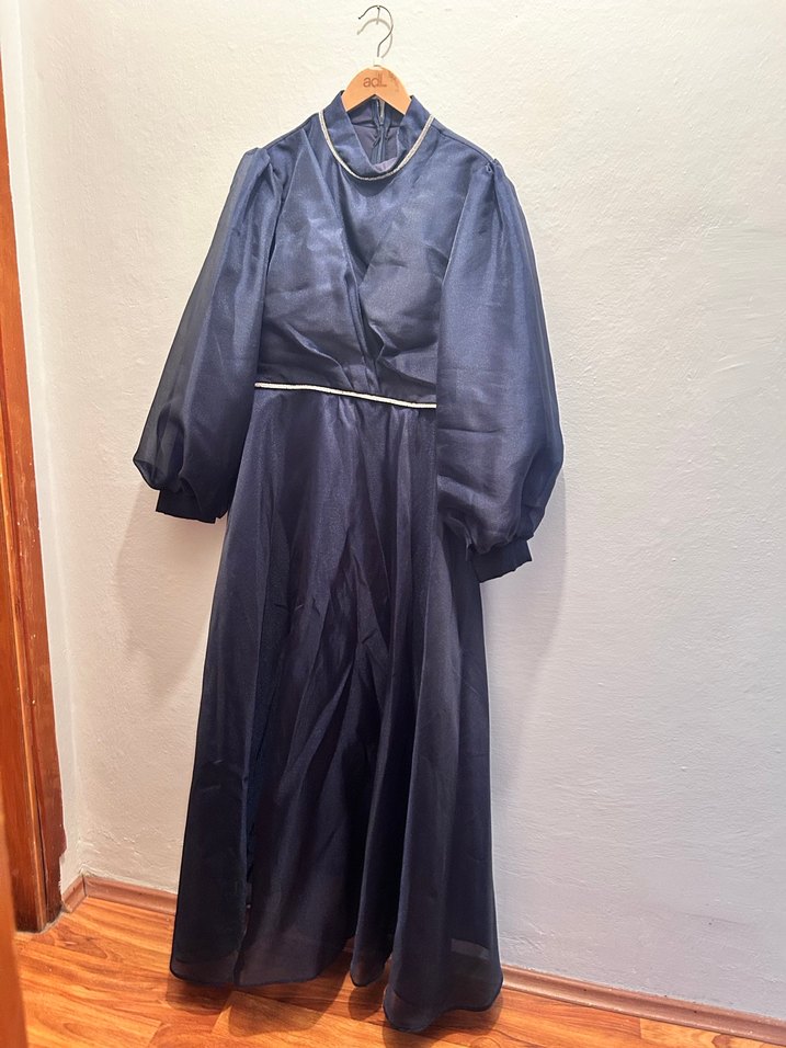 Lacivert uzun abiye elbise, yüksek yakalı ve bol kesimdir. Şal dahildir 2 defa giyildi
