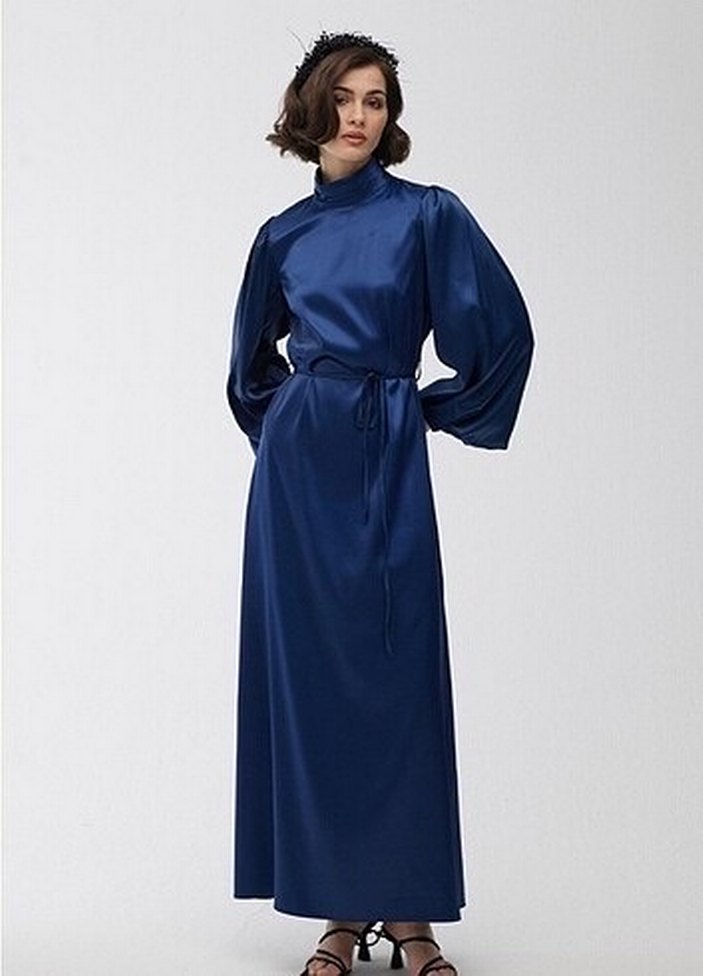 Kadınlar için yüksek yakalı, uzun kollu, parlak lacivert renkli, ipek gibi dokulu, drapeli ve düzenli kesim uzun elbise. Ofis için klasik ve modern tarzda uygundur. ✨ 36 beden #manuka marka. Küçük bir ip çekiği var belli olmuyor fazla 165 boy 60 kilo ile giyiniyorum.