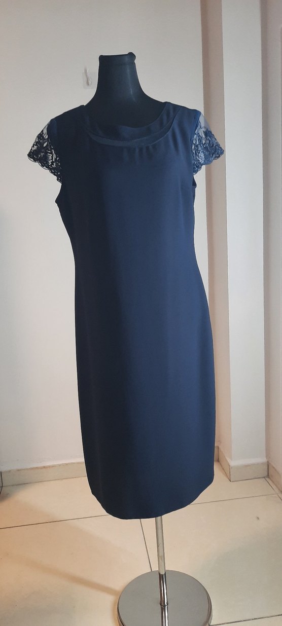 Lacivert kadın elbise, bisiklet yaka ile dikkat çeker. Klasik ve modern bir tarz için kolsuz ve rahat kesimlidir. Sıfır ayarında bir kez giyildi