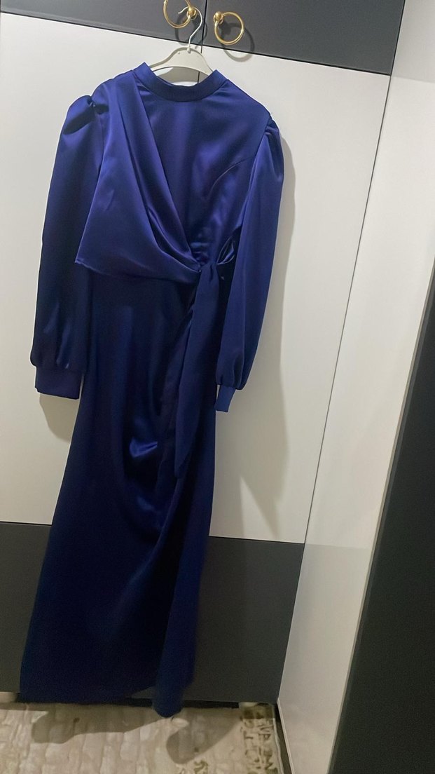 Uzun lacivert kadın elbise, yüksek yakalı ve uzun kollu olup drapeli detaylara sahiptir. Düz ve regular fit kesimlidir, ofis için uygundur.