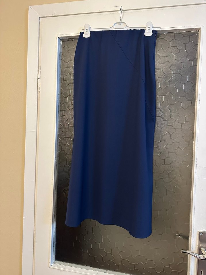 Lacivert renkte, drapeli ve regular fit uzun kadın eteği. Yumuşak sentetik kumaştan, sade ve minimal tasarıma sahiptir.