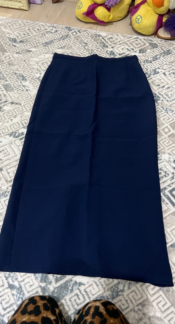 Lacivert uzun etek, drapeli tasarıma ve rahat kesime sahiptir. Sentetik kumaştan üretilmiş olup iş ortamları için uygundur.