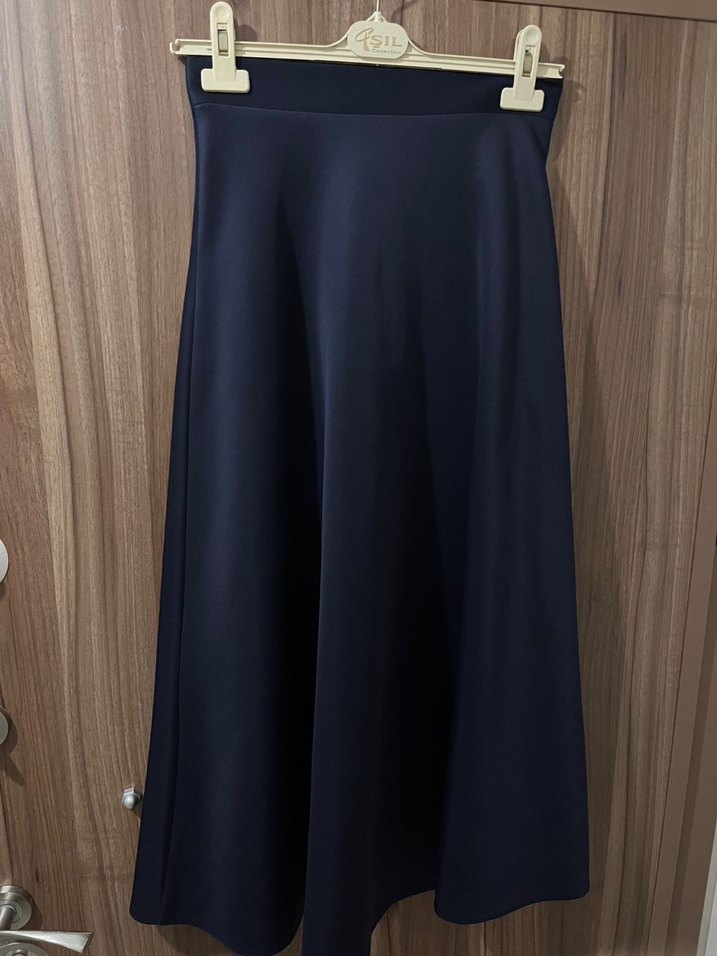 Lacivert renkte, drapeli uzun kadın etek. Scuba kumaştan, regular fit kesimle ofis için uygun minimalist sokak stili. Sadece bir kere bayramda giyildi.