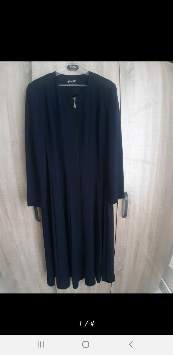 Lacivert uzun kaban, drapeli tasarım ve kesik yaka ile. Uzun kollu, rahat kesim ve yumuşak, sıcak kumaştan ofis kullanımı için uygun.
